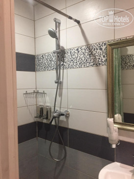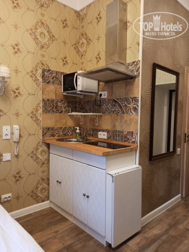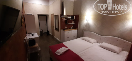Само здание отеля реконструировано не давно, где то года 1,5 назад . Из старого, видимо заброшенного, здания. Поэтому наружный вид его совсем не впечатлил. Но внутри уже все по другому. Здание 3- х этажное. Номера по площади совсем не большие, но все в номере есть.Есть телевизор ЖК. Номер оборудован кухонным уголком с плитой, электрочайником, посудой на двоих, даже сковорода и кастрюлька есть. Мы понятно этой кухней не пользовались. Есть сейф, фен, холодильник не большой. В туалетной комнате душ, для меня удобный. Шампунь, гель для душа и даже зубную пасту с щеткой кладут,бритвенный прибор, но это все в пробном вариант. Рекомендую брать свои туалетные принадлежности, если приехали не на одну ночь. Есть одноразовые тапочки. У нас был включён завтрак- шведский стол. Я бы сказала, что завтрак достойный. Выбрать есть из чего. Есть кофеварка автомат. Работает капельным способом. Что бы накапало в чашку, надо время. Поэтому за кофе стоит очередь. Но кофе вкусный.
