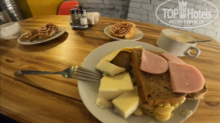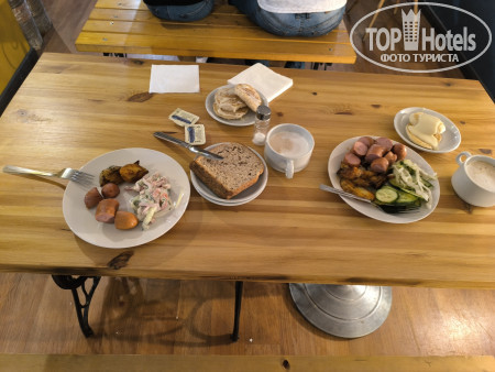 Еще за свою небольшую стоимость в проживание был включен завтрак в виде шведского стола. Завтрак однообразный, но вполне съедобный. Каша на молоке, омлет, вареные яйца, сосиски или тефтели, макароны или рис с овощами, фасоль тушеная, творог и сметана, свежие огурцы, салат из свежей капусты, салат из свеклы, хлопья и молоко, хлеб, ветчина, сыр, печенье и сушки, сваренный кофе, морс, чай.